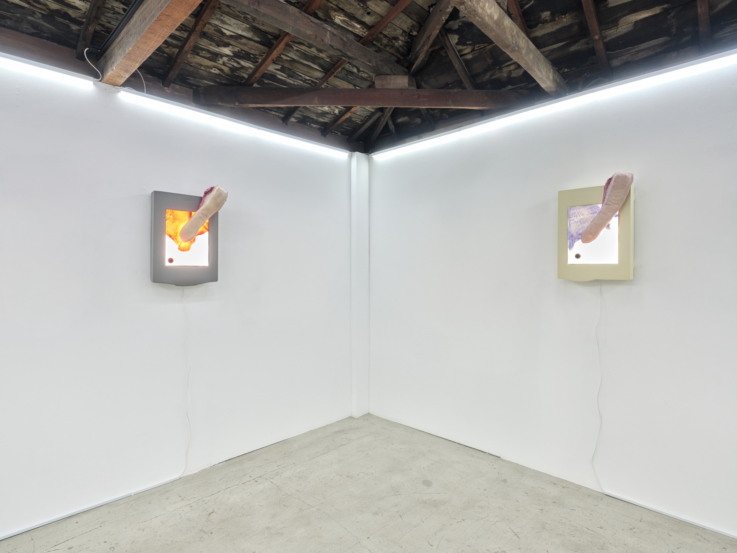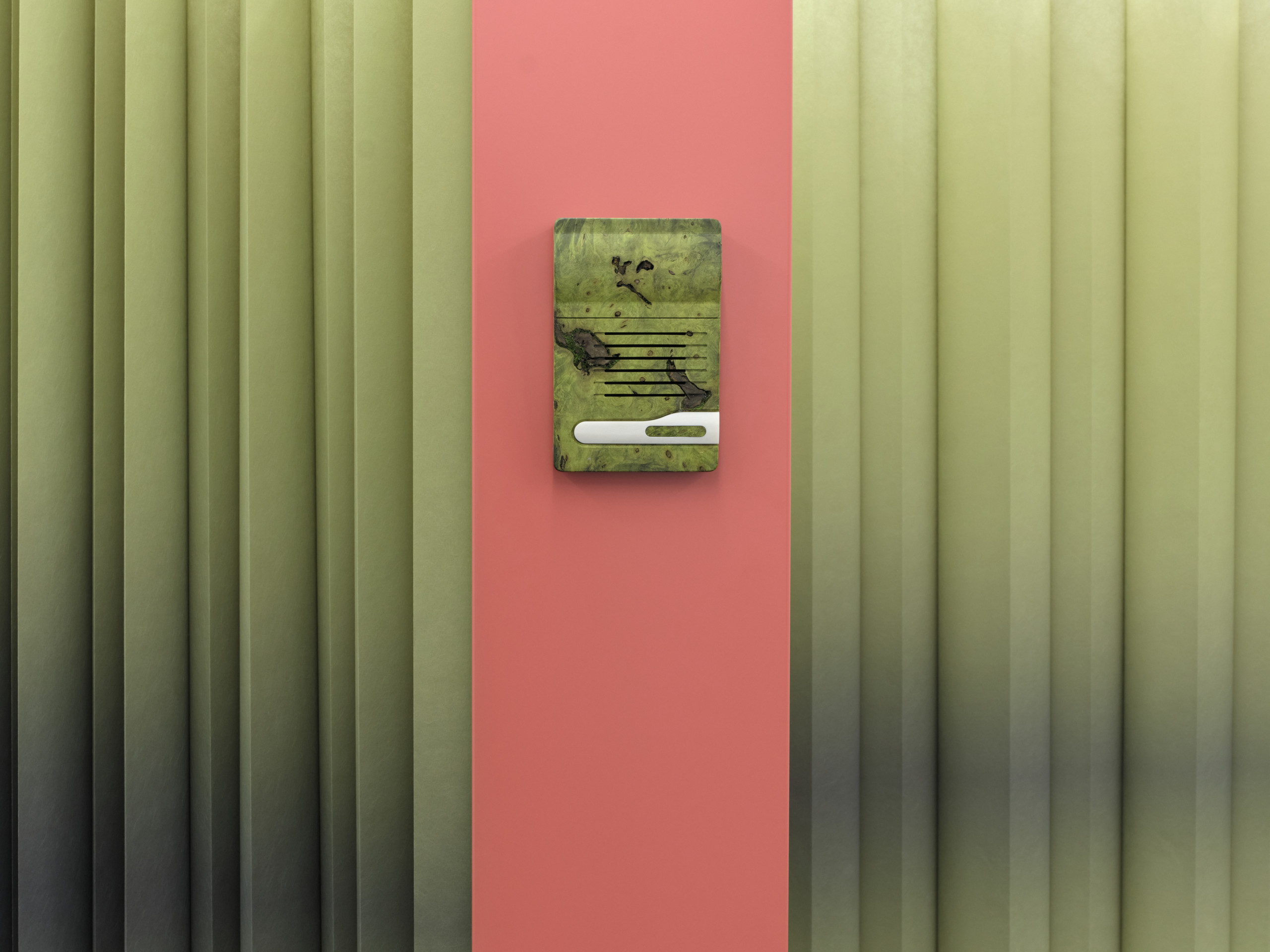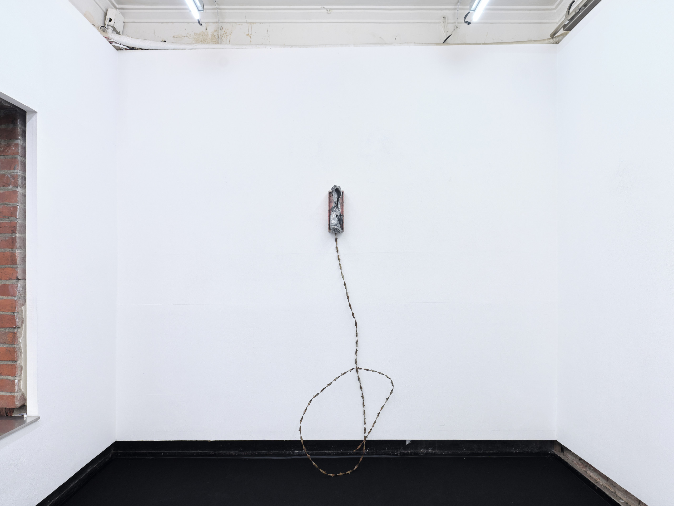 “Chain-of-thought” traces these parallel dynamics across four bodies of work that reanimate obsolescing hardware. Accompanying Model Collapse, there are Twisted Pairs, a series of sculptures that resemble wall-mounted telephones, made from cast cow ears nestled into each other with a cord of corroded, barbed wire. As America’s “Last Frontier” was colonized in the 19th century, private cattle fencing became transmissions lines for the spread of telecommunications through rudimentary local networks, a precursor to the way data centers now graft onto power-plants. Every now and then Twisted Pairs emit a whistle to one another, like lost signals from a severed grid.