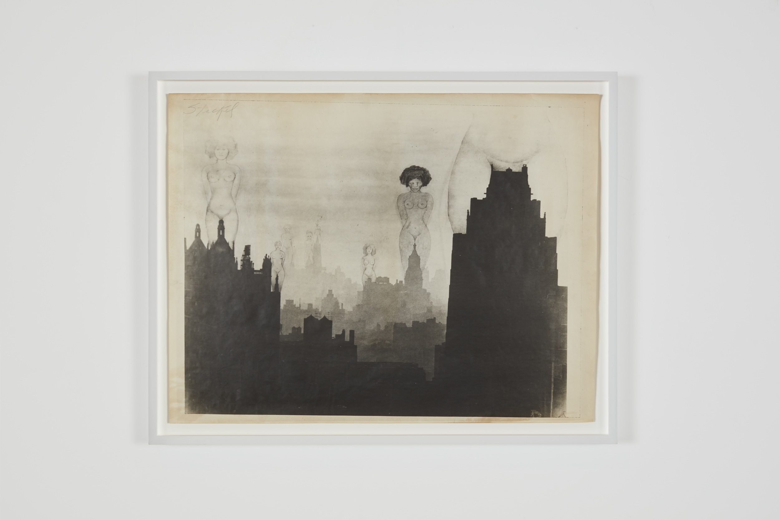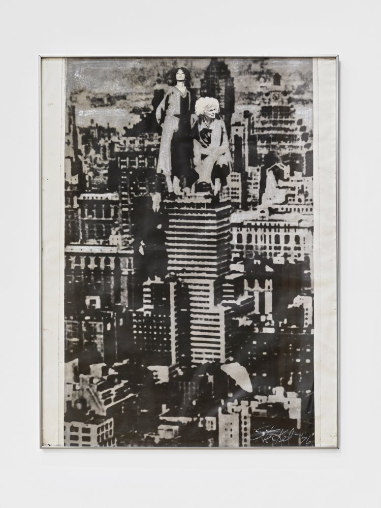 Steckel’s work suggests that the phallus can be read as a symbol of oppressive forces within the public sphere, where gender and power relations are played out and co-entwined. Steckel recurrently explores these dynamics with the imagery of urban space, for instance in the Giant Women series (1969-1974). New York City in particular is used as a backdrop against which the imposing bodies of women are deployed as signifiers of vulnerable unease. Such strategies reveal an underlying tension, one where the phallus is granted as an object of sexual desire while harbouring latent aggression. Its physical manifestation within the modern metropolis therein becoming a potential playground for emancipatory release.
