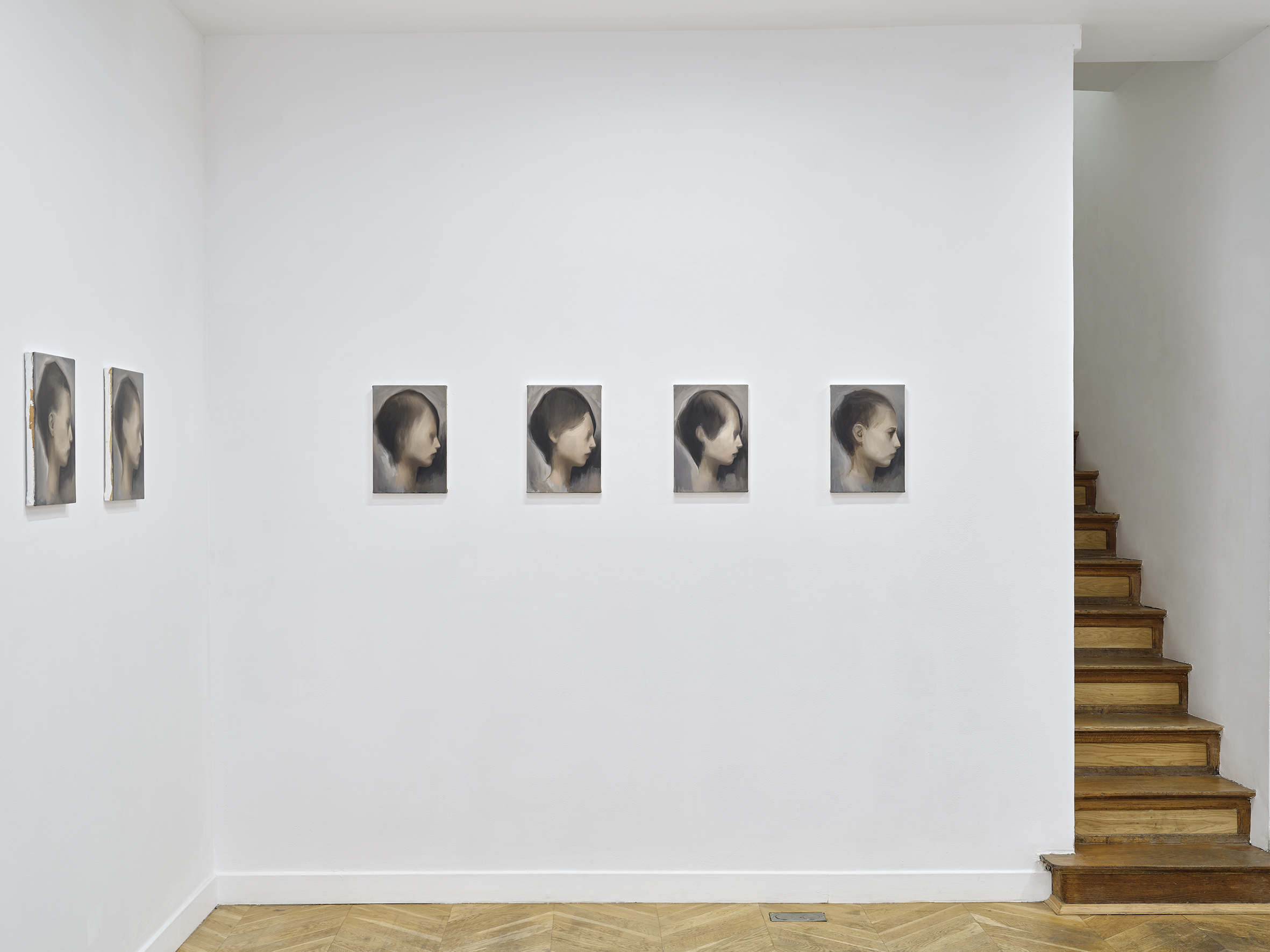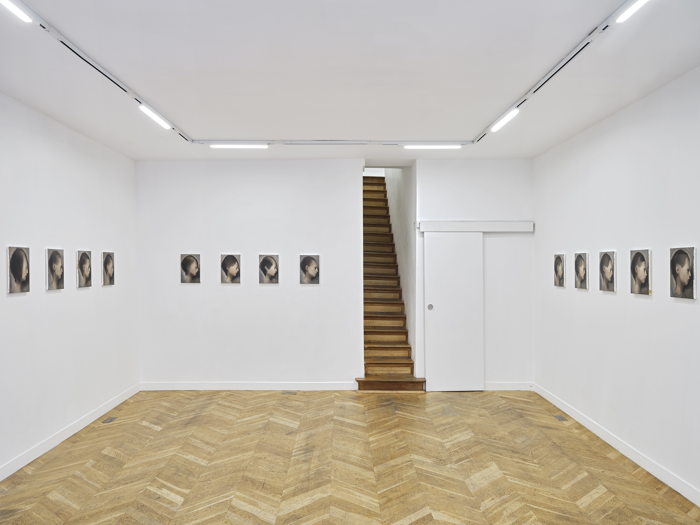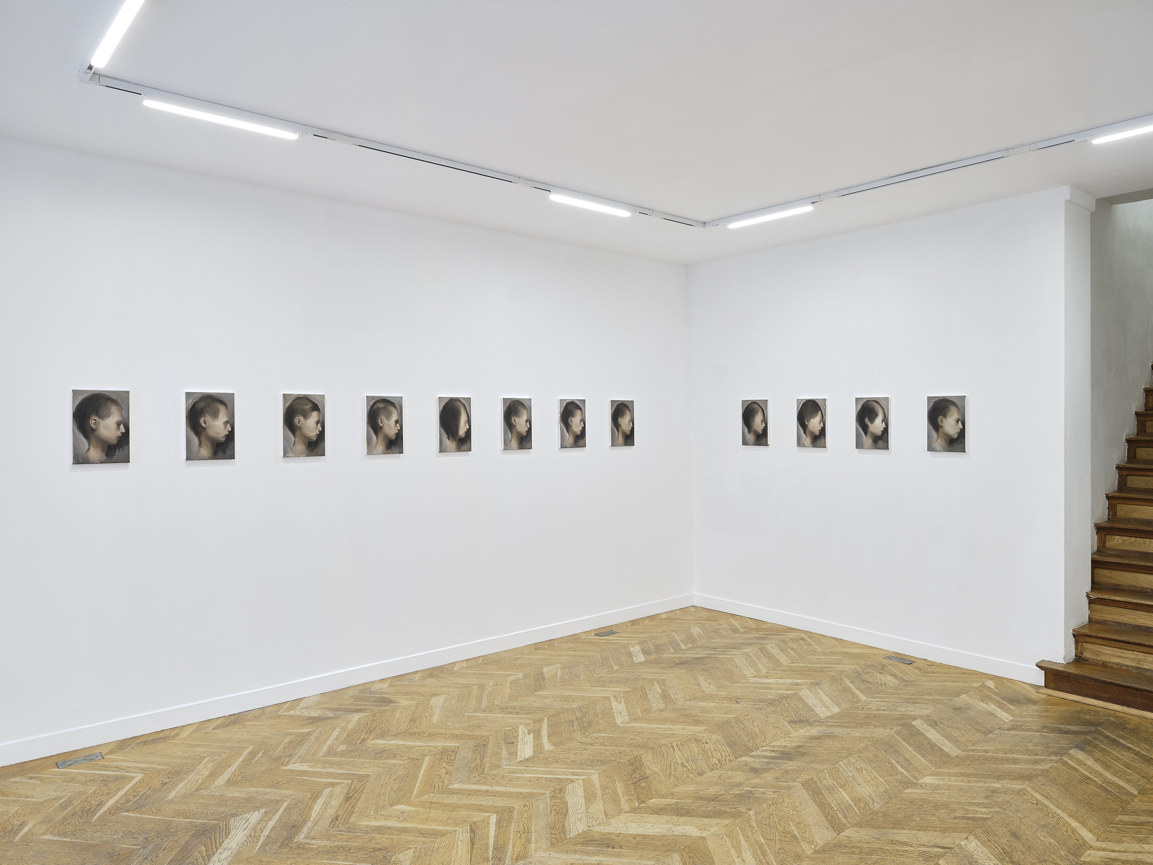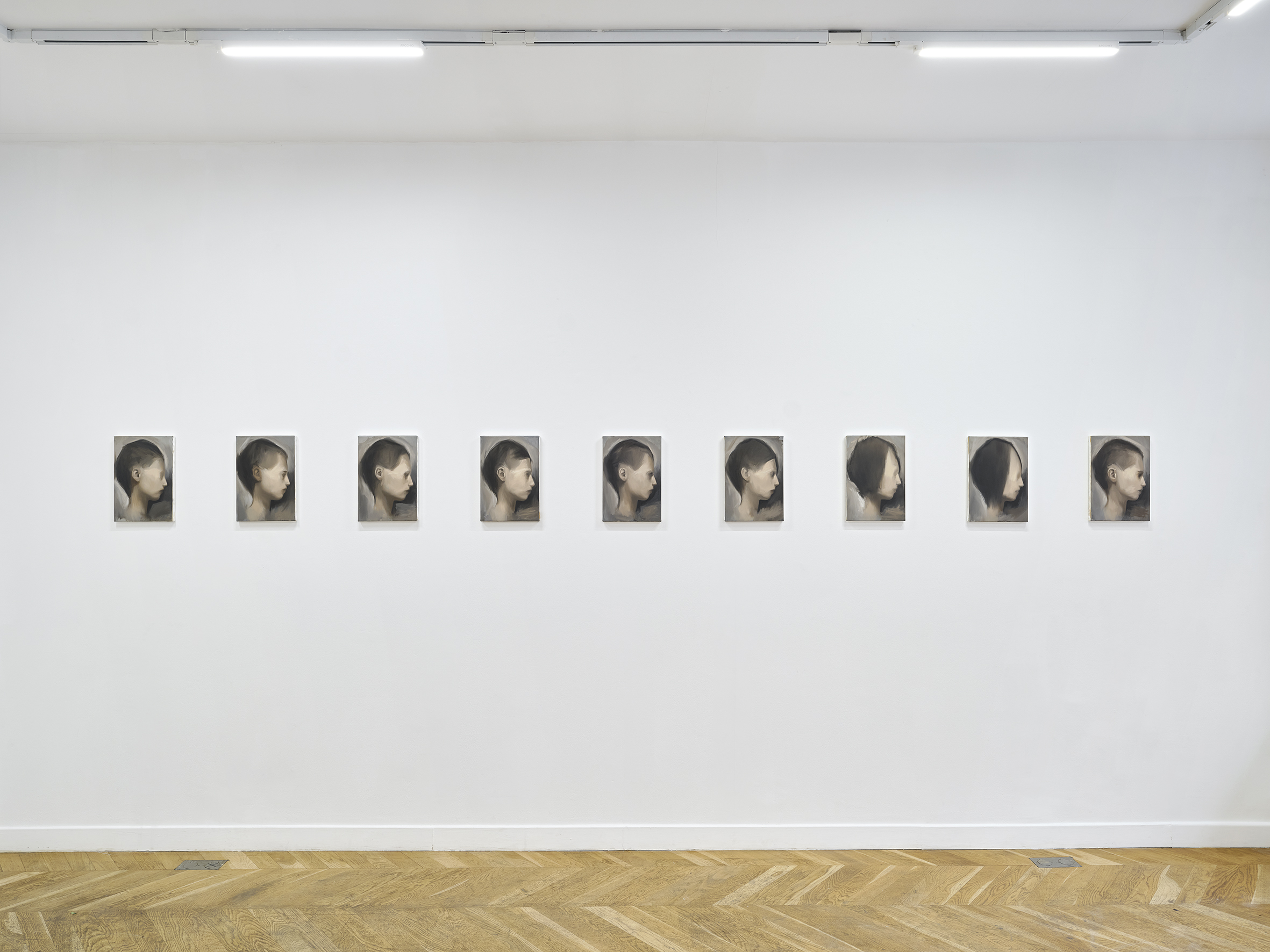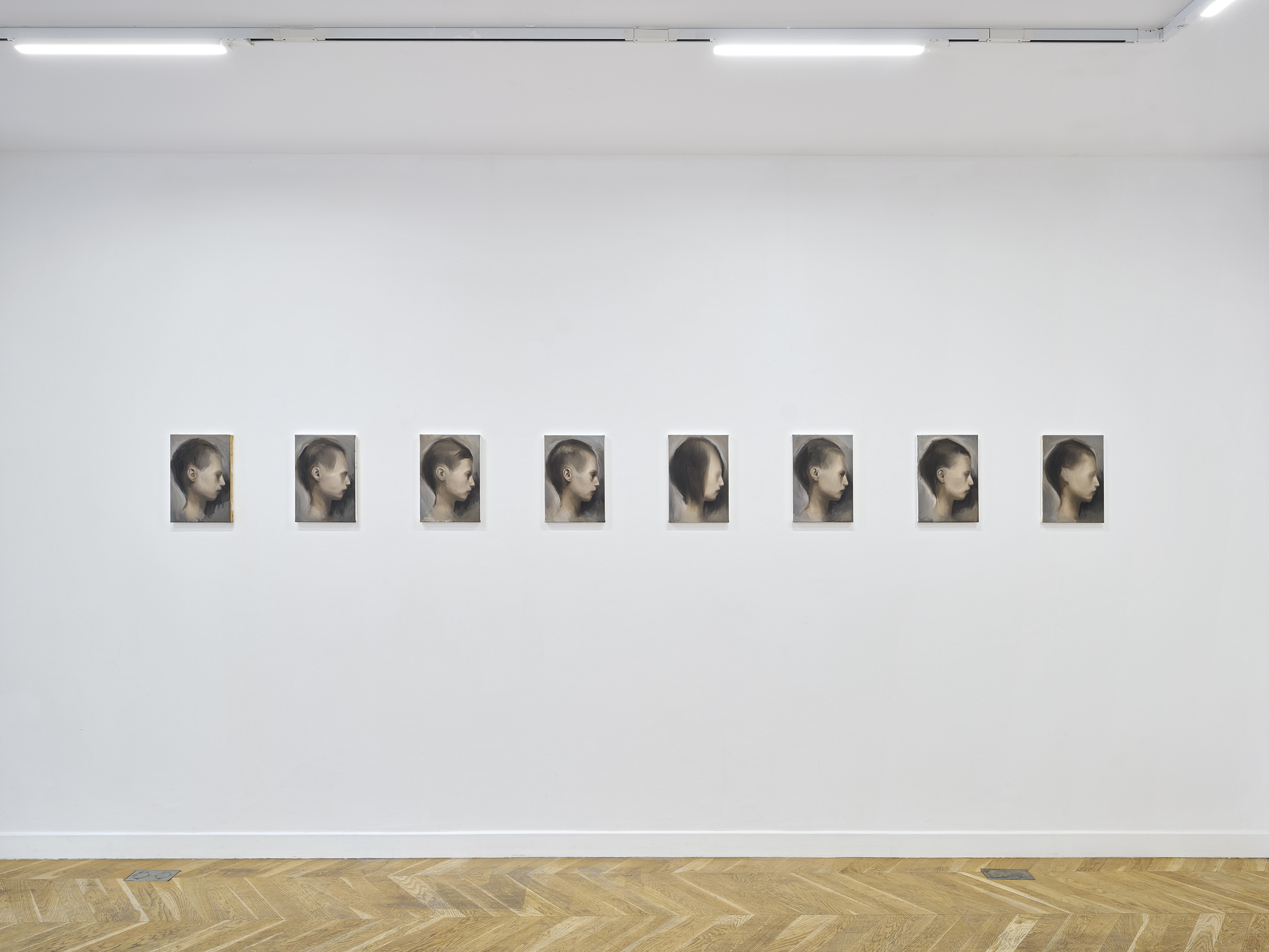 The exhibition is a series of twenty-one portraits conceived as a single work. They are as much portraits of family members displayed on a dresser as they could be mugshots, morgue photographs, or classic iPhone selfies. None of them apply to a face in memory, none. Rather a combination of several reassembled remembrances, as one would do to generate a composite sketch. The texture of each painting is worked in such a way that it resembles skin; smooth and irregular. A superposition of about ten layers. They record, classify, measure, exclude, sort. Something that has to do with lies, with the idea of a correction. That repeats itself with an objective. Pale, frail bodies. They are a bit melancholic.