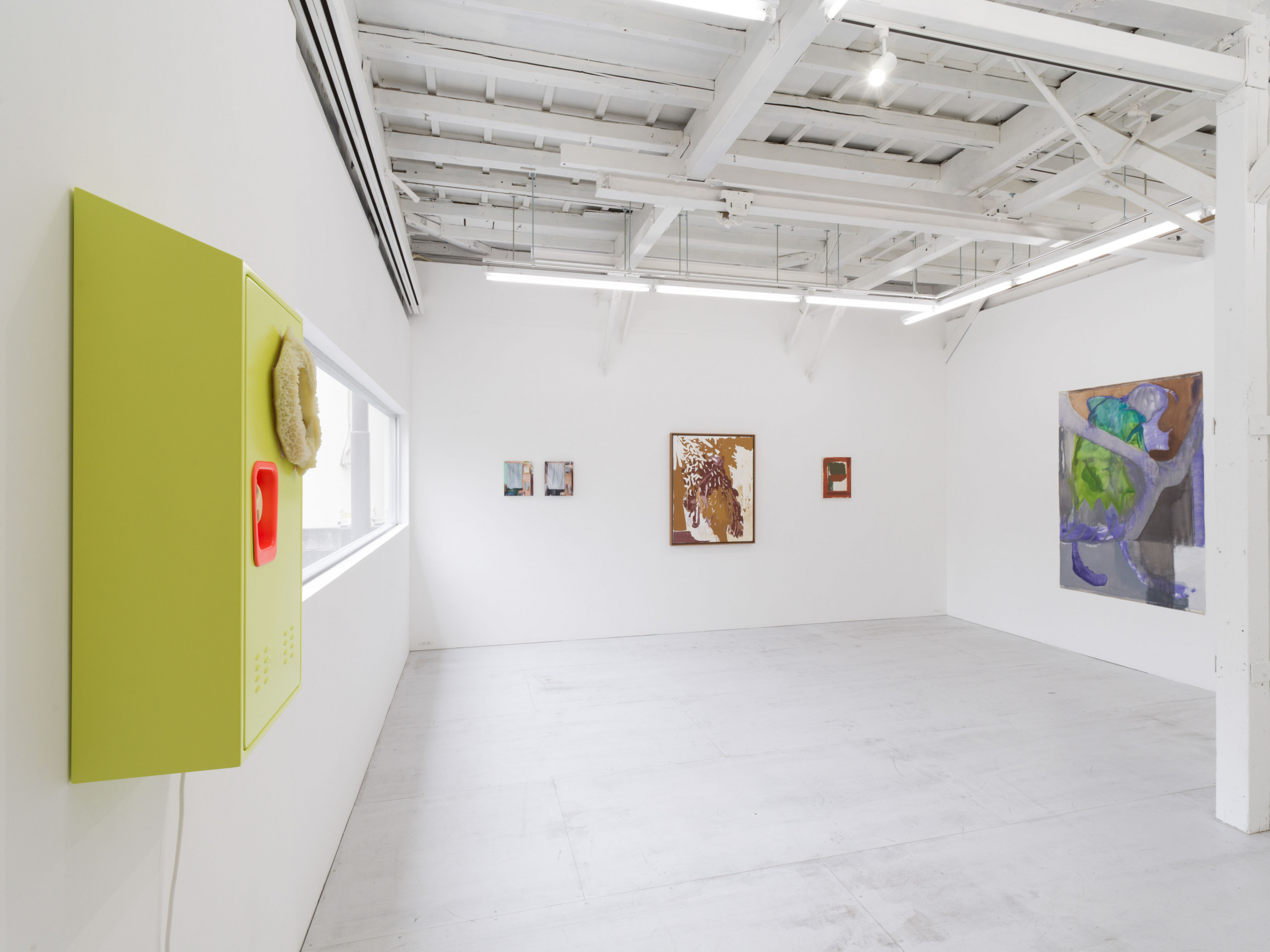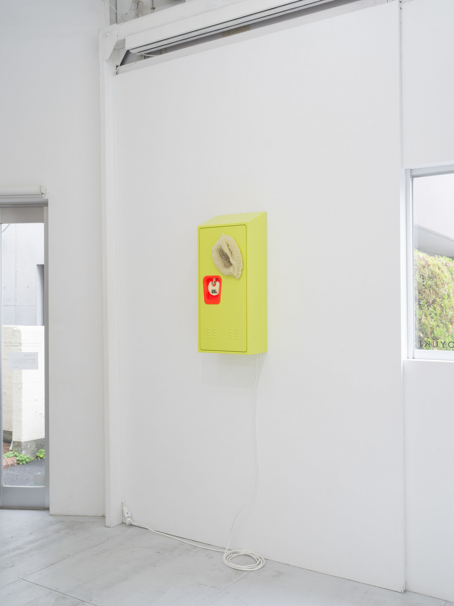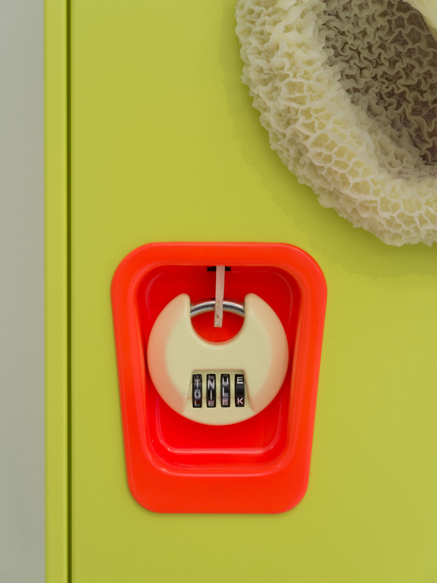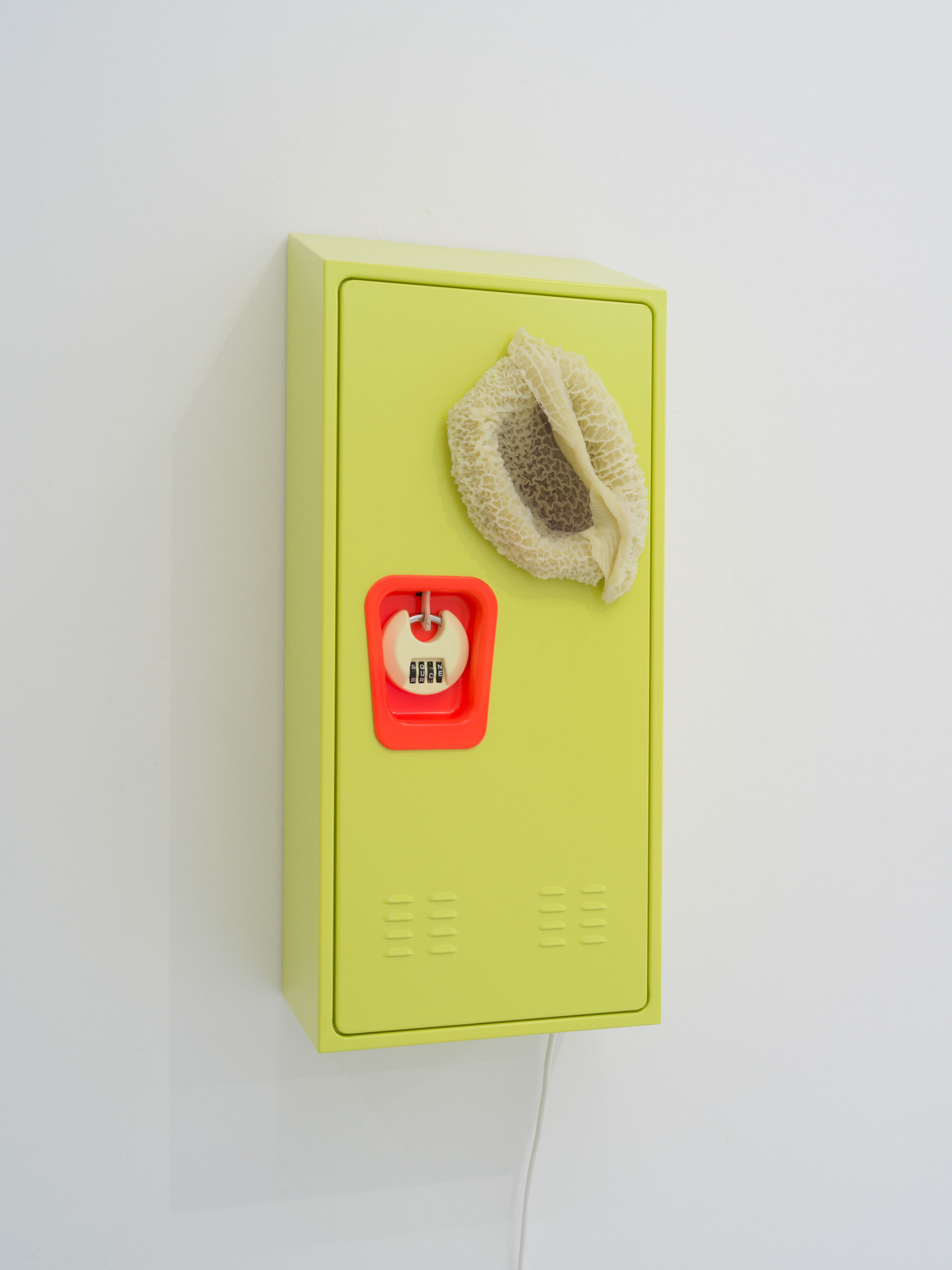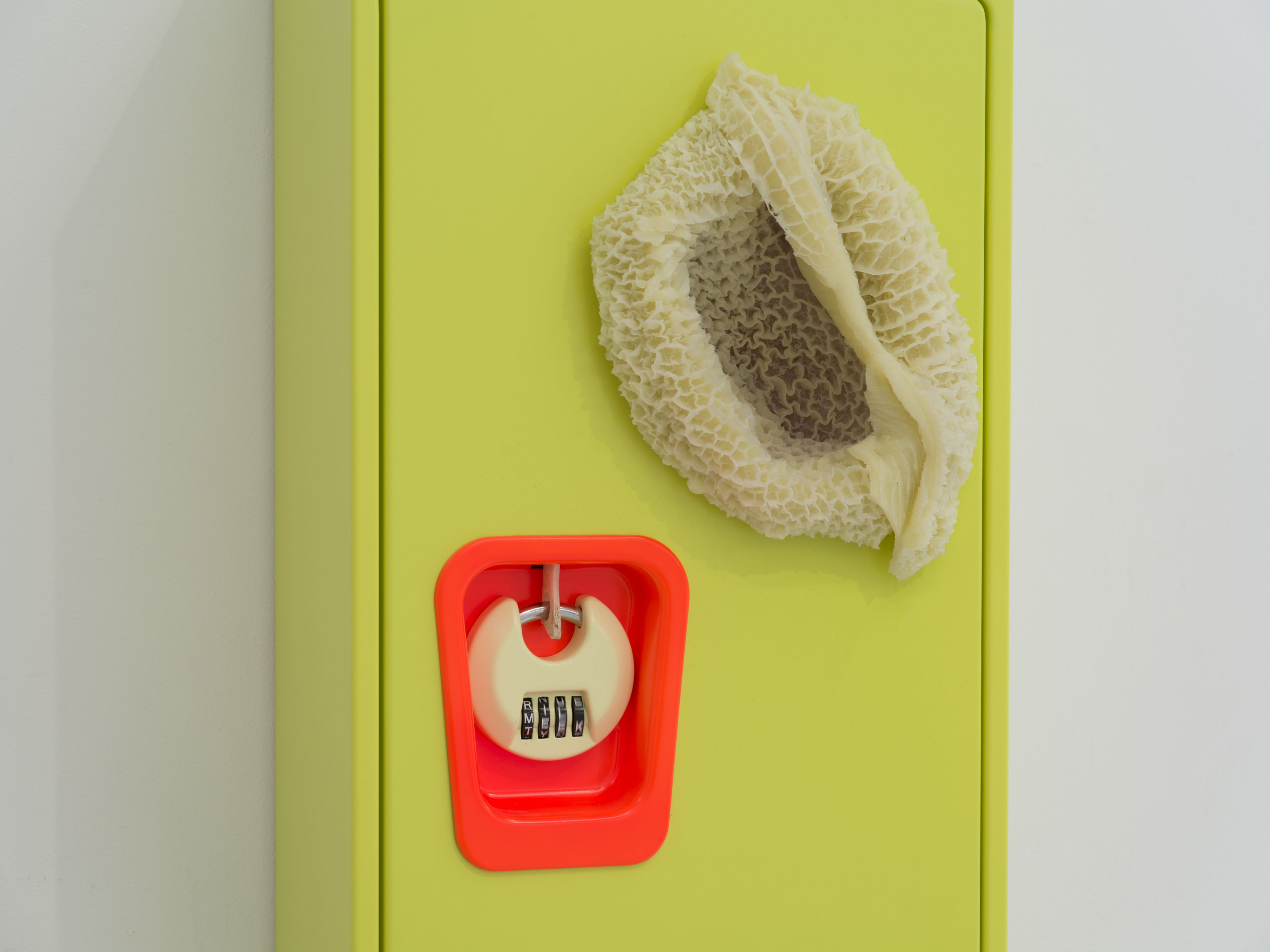 Cooper’s steel locker, adorned with a silicone cast of a cow stomach, hints at a rather omnivorous appetite, unable to classify altogether. By quite literally flipping its stomach inside out, perhaps to streamline consumption, the piece transforms into a reflective surface, talking back at the viewer in real-time, like a distorted mirror.